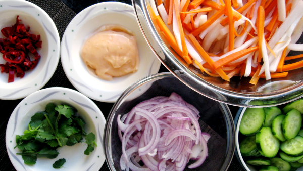 Before we get to the cooking, I need to warn everyone about my utter inability to measure while I cook. I don’t mean that I don’t know how to use a measuring cup or spoon. I am perfectly capable of following recipes–packing brown sugar into measuring cups, leveling off a teaspoon of baking soda–but when I cook Vietnamese food, even when I am consulting a recipe, there are no measuring cups or spoons. I sprinkle/dash/squirt, taste, repeat, repeat, repeat. In this way, I’ve discovered that Vietnamese food is incredibly forgiving, allowing flavors to meld and rebalance during cooking and even at the table with an assortment of sauces, aromatic herbs and pickles.