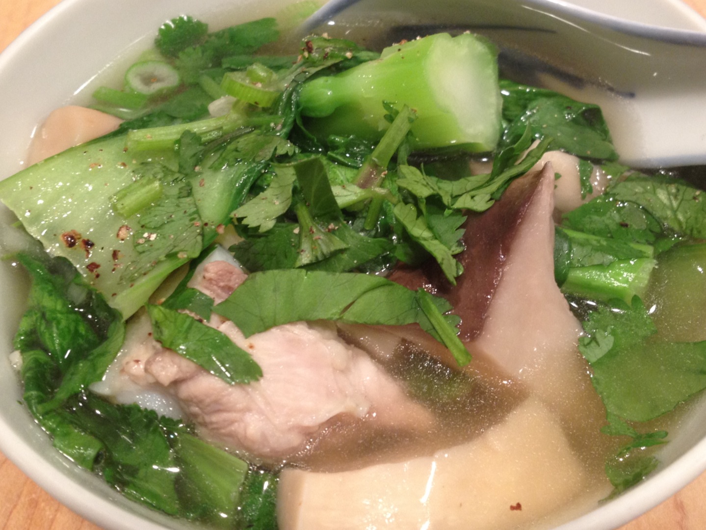 For an easy, no fuss canh, I like to use pork spare ribs, mustard greens, and king oyster mushrooms. Other easy and equally excellent combinations are pork/tofu/mushrooms, fish/tomatoes/ong choy, pork/fuzzy squash, pork/butternut squash. And in addition to pork ribs, ground pork or shrimp (mixed with chopped scallions, salt and pepper) and fish heads also make very tasty canh broth. So look in the fridge and see what fabulous combinations you can come up with!