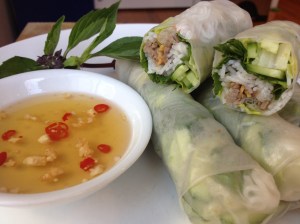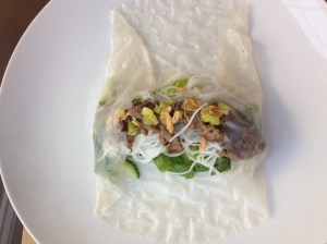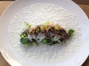 I am not particular about the brand of rice paper, though my mother swears by the Rose Brand. In any case, wet both sides of a sheet thoroughly with hot water–either by dipping in a bowl or holding under the faucet for a few seconds. Place the sheet of rice paper on a plate; it will soften in about a minute. Add lettuce/cuke/herbs, noodles, beef, scallion oil, and fried shallots. Be careful not to use too much filling and keep everything towards one side of the sheet. Roll tightly (think cigar rather than burrito) taking care not to break the rice paper. Repeat. Keep rolls moist under a damp paper towel or dish cloth. Eat rolls immediately, dipping in nuoc cham.