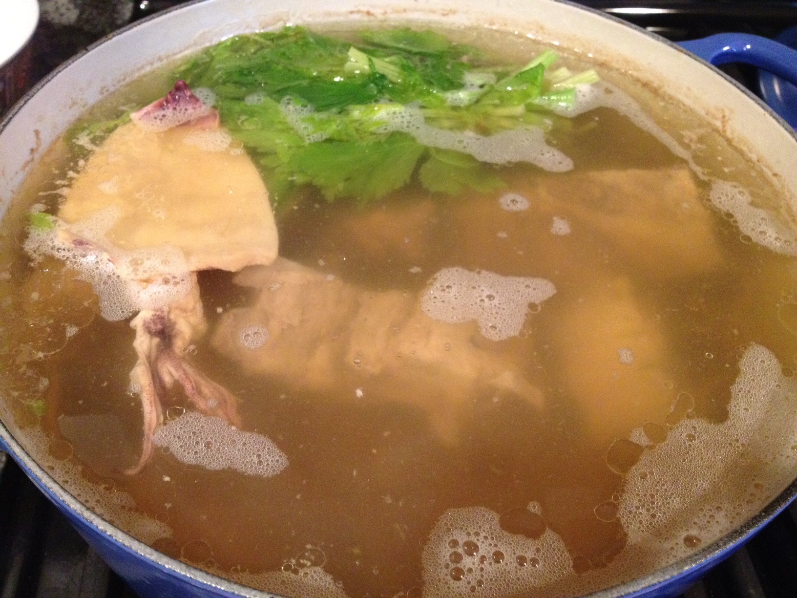 In a toaster oven or pan, lightly toast 2-3 whole dried squid (also called cuttlefish) until you can smell them; remove and add to soup pot.