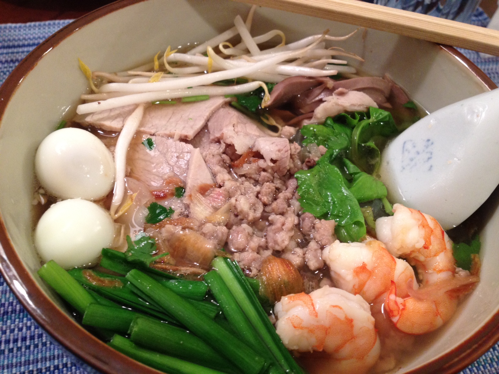 Assembly: In a bowl, layer first the noodles, then some sliced pork, ground pork, shrimp, quail eggs, cilantro, chinese chives and celery. Add a dash of black pepper and a sprinkling of fried shallots. Heat soup to a simmer and ladle into the bowl, making sure to pour some directly onto the cilantro, chives and celery to release the aromatics. Serve immediately with a plateful of basil, bean sprouts, and lemon wedges. Makes 6-8 servings.