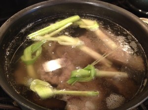 After 5-6 hours of simmering (feel free to simmer longer if you’d like but the longer the stock simmers, the more I would encourage straining before seasoning), remove and discard bones, lemongrass and pineapple. Skim off any impurities or pieces of meat/fat that may have fallen off.