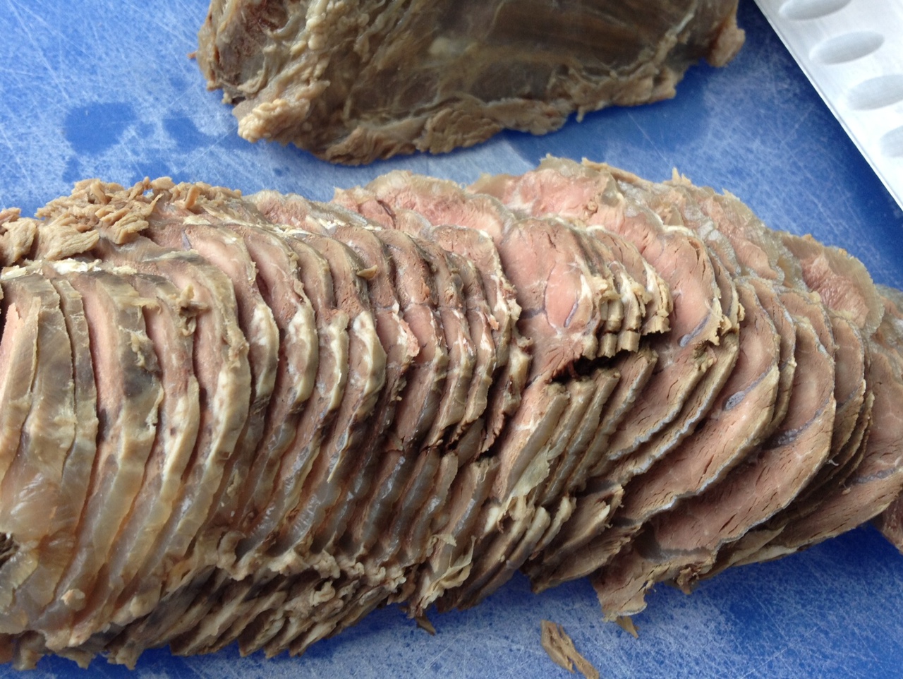 After 1-1.5 hours remove the pork meat and submerge immediately in cold water–less cooking time if pork is cut into smaller pieces. Pork should be firm to touch, like the base of your thumb. Once cool, discard water and thinly slice meat against the grain and set aside.